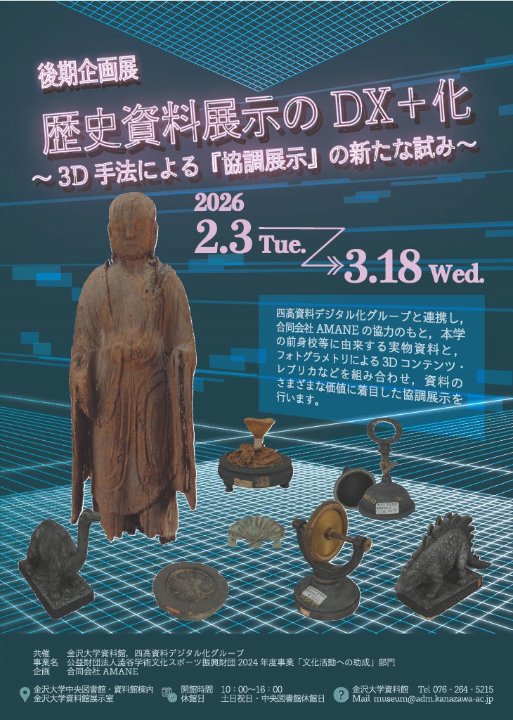 金沢大学資料館では,企画展「歴史資料展示のDX+化~3D手法による『協調展示』の新たな試み~」を開催します。この展示は,当館と四高資料デジタル化グループ(研究代表:金沢大学学術メディア創成センター准教授 髙田良宏,協力:合同会社AMANE)による共催展です。