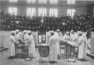 明治38年、石川県金沢病院(金沢医学専門学校の臨床部門)は金沢市小立野台に移転、新築された病院には医学生に実地臨床を教育する大臨床講義室が設置された。講義室は学生の見学するところは階段式、外科手術を実施するところはタイル張りである。 写真では二例の手術が施行させている。内容は不詳向かって右の手術台では外科学教授下平用彩が執刀している。通常の手術は別の手術室で行われる。
