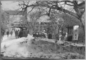 石川門に向かう受験生。昭和28年1月14日から同34年3月31日まで保存修理工事が行われている(『金沢大学十年史』,1960)。 現存する石川門は宝暦9年の火災による焼失の後,寛政1年に再建されたもの。 昭和10年に国宝の指定を受けるが,昭和25年に重要文化財に指定替えされている。 石川軍政隊司令部発・石川県知事宛「金沢城址に関する件」(昭和21年12月3日)は,「北陸総合大学設立準備委員会」に大学設立のための「金沢城址の五カ年の条件 付き借地権を与える」ものである。条件のひとつに「城門及び古い倉庫は歴史地域として独立の機関が之の保有にあたること」とある。「城門」「古い倉庫」は石川門と三十間長屋を指し,軍政隊は文化財の保存に理解を示している。 石川門は金沢大学の正門であったが,昭和24(1949)年5月13日に開催された金沢大学創設委員会第8回委員会では,大学の正門を大手門とすることが協議されている。陸軍時代「衛兵所」は大手門脇にあり,大手門を正門としていたことを踏襲したものであろう。