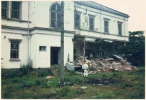 No. 98 のパネルと同じ建物。金沢城跡二ノ丸,極楽橋寄りにあった。明治31(1898)年金沢に設置された第九師団の司令部庁舎の一部。創設期には,二ノ丸中央の庁舎とともに,大学本部が置かれた。(二の丸中央の庁舎は,昭和43(1968)年に石川県が購入,同年金沢城内から金沢市石引の現在地に移築。その際,建物の両翼を切り縮めた。昭和49(1974)年から現在まで石川県健民公社として使用。)この建物が取り壊された後,法文学部2号館が昭和48(1973)年に竣工している。