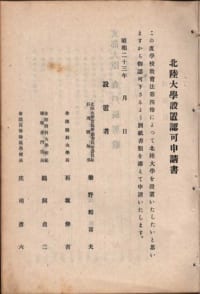 北陸大学設置認可申請書:「学校教育法施行規則」第2条と第3条により,学校の目的・名称・位置・学則・経費および維持方法・学校開設の時期が記載されている。さらに校地・校舎・体操場・寄宿舎等の図面を添付。学則には修業年限教科課程および授業日数に関する事項を記載。